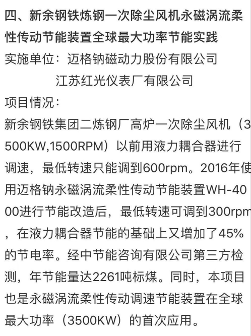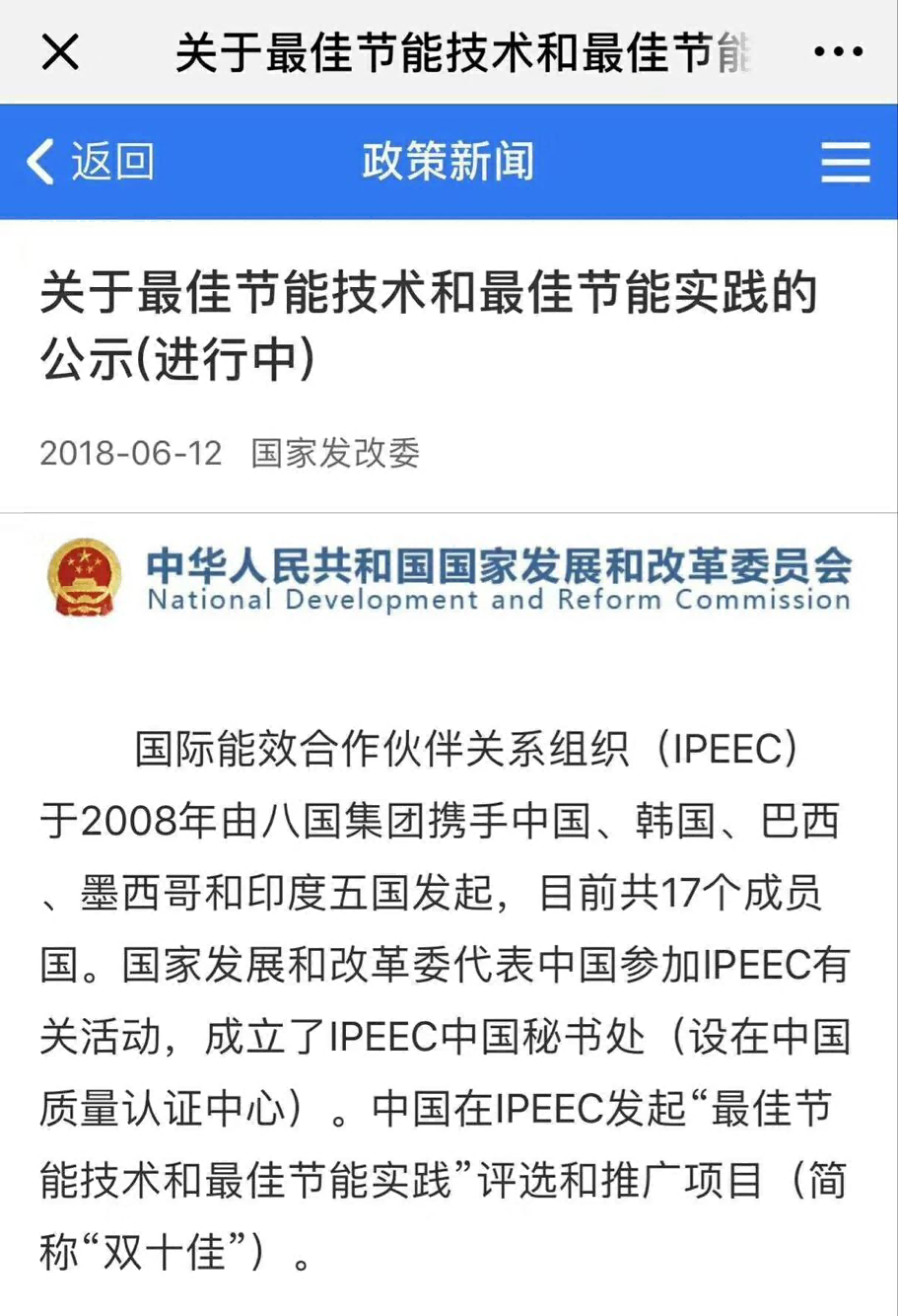 近日,我公司(sī)“一次除塵風機(jī)永磁渦流柔(róu)性傳動節能裝(zhuāng)置”技術(shù),獲得由國際能效(xiào)合作夥伴關係組織(zhī)(IPEEC)發起的“最佳節能技術和最(zuì)佳節能(néng)實踐”評(píng)選和推廣項目(mù),並在國家(jiā)發改委網站予以(yǐ)公示。