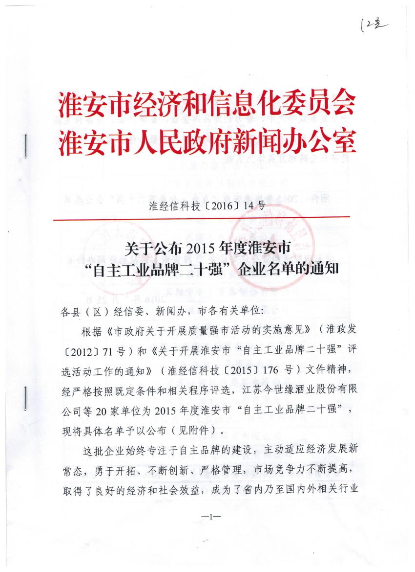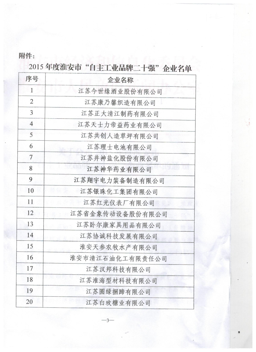 根據市政府評選,我公司被認定為淮安市“自主品牌二十強”企業。“自主(zhǔ)品(pǐn)牌二十強企業”是我市在國內相關行業(yè)具有代表(biǎo)性(xìng)並且競爭力較強的企業,我公司(sī)名列第11名。