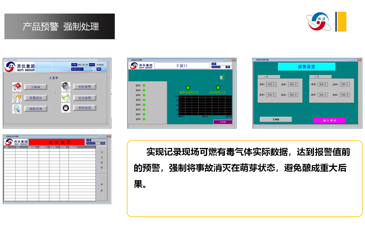 通過現(xiàn)場可(kě)燃/有毒氣體探測器(qì),現場裝置某區域,安(ān)裝位置相對集(jí)中12路氣體檢(jiǎn)測器,信息輸入本係統裝置。智能區域報警器控製裝置安裝在主要通道邊上(shàng)或(huò)該區域四周及車間和中控室外圍,當現場氣體濃度超時,該裝置二級報警,第一時(shí)間快速讓現場工作人員訊速撤離(lí)。同時可(kě)推送手機終端報警。有效控製事故的發生,保護了人生安全。